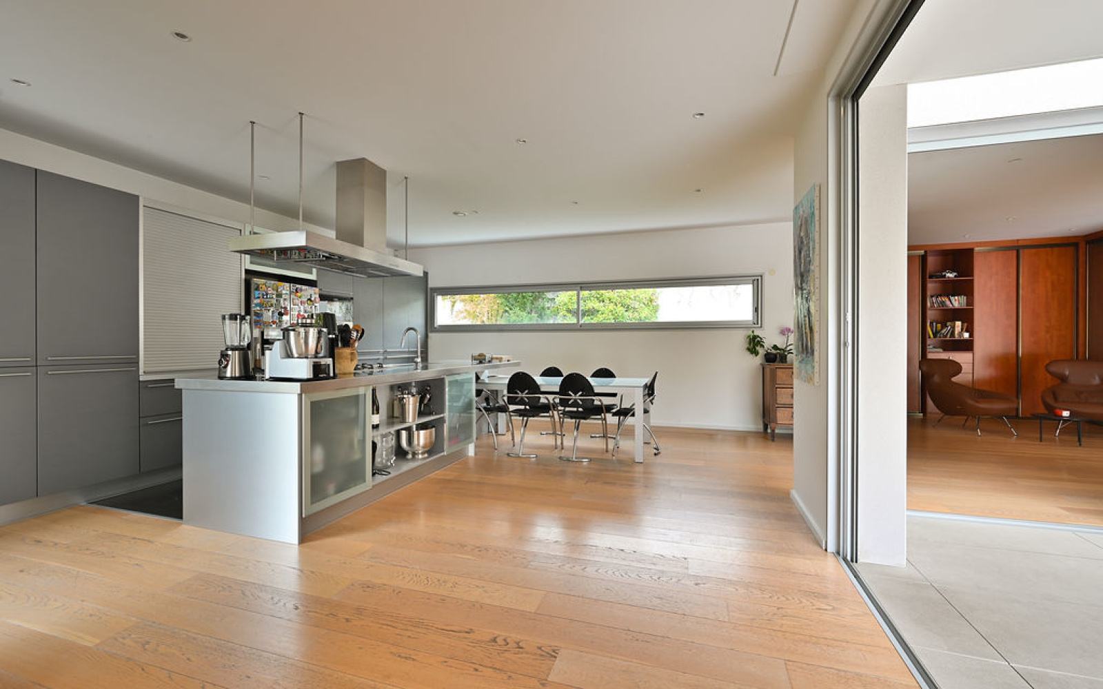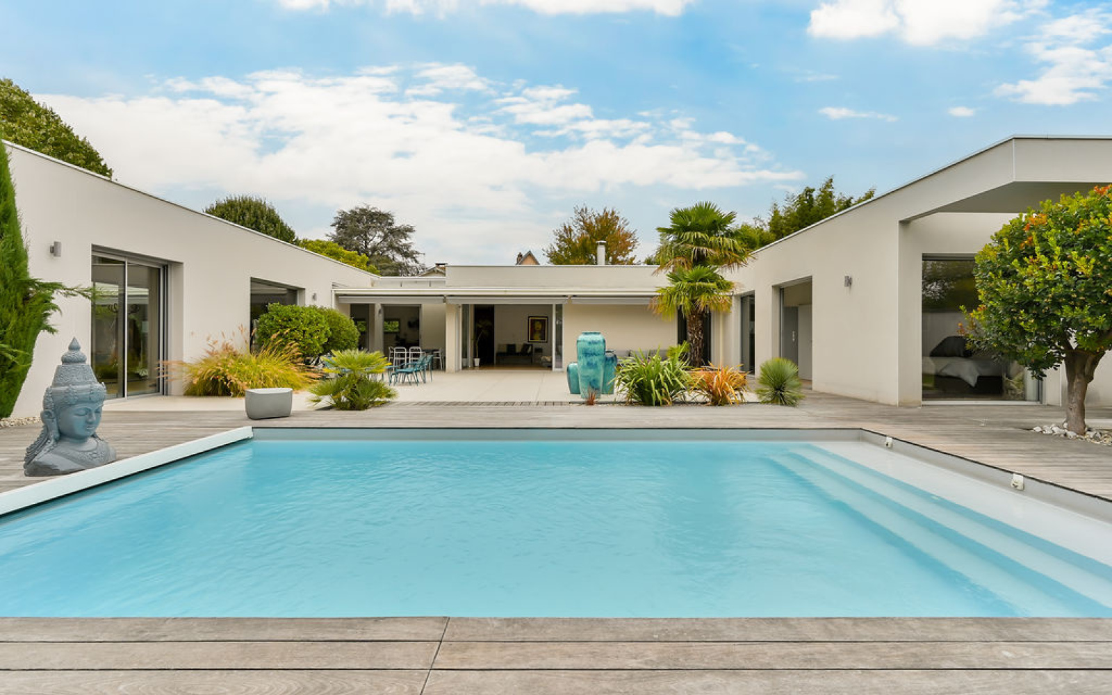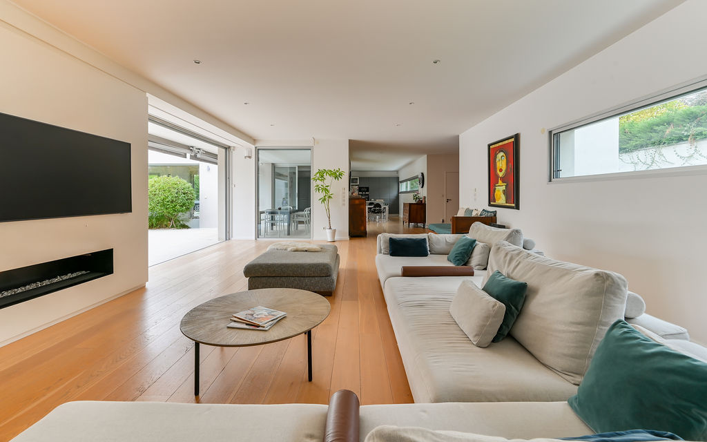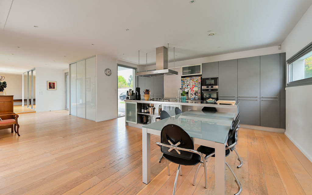 Écully (69130)ECULLY, rare, secteur calme et résidentiel, à proximité immédiate du centre du village, des écoles, des commerces et transports, superbe maison contemporaine de plain-pied de 294 m² carrez et 302 m² avec annexe sur un terrain arboré et paysagé de 2 224 m² avec piscine. La maison se compose d'une entrée avec vestiaire, d'une très belle pièce de vie de 125 m² environ avec cheminée entièrement ouverte sur la terrasse de 267 m² et la piscine, une suite parentale avec dressing et salle de bains donnant sur piscine et terrasse, une suite avec sa salle de douche, une 3eme chambre ou bureau. Dans l'autre aile de plain-pied, un dégagement dessert 2 autres chambres, une salle de bains, toilettes, espace buanderie. Toutes les chambres sont climatisées. Le jardin plat et arboré bénéficie d'une piscine chauffée de 8x4m² avec rideau électrique. Un garage couvert, fermé et sous alarme, un carport, un local piscine de 3 m² (PHmetre et gestion du sel automatiques, pompe à chaleur, pompes et filtres), un abri de jardin de 12 m² et 7 places de parkings extérieures complètent ce bien d'exception. Belles prestations, quartier recherché sur Ecully, chauffage au sol, climatisation, maison contemporaine très lumineuse et entièrement de plain-pied.