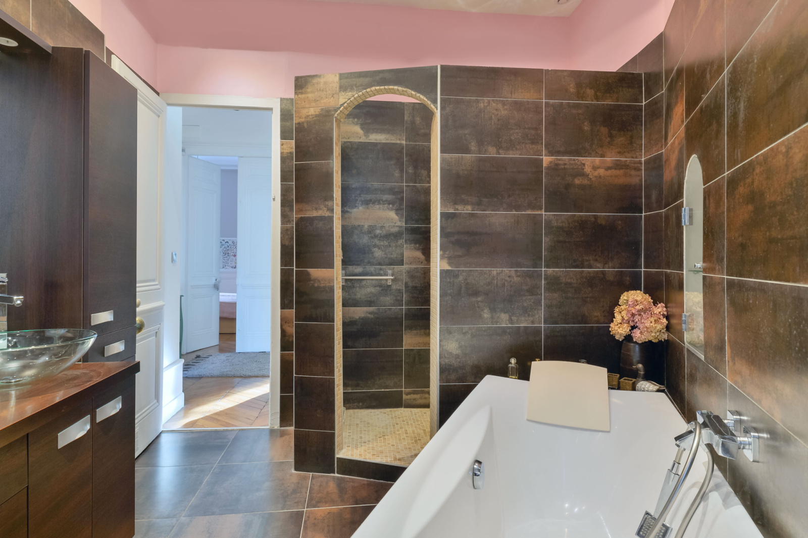 La partie nuit se compose de deux chambres spacieuses, dont une suite disposant d'un dressing intégré, la salle de bain, dotée d'une baignoire et d'une douche, complète l'ensemble avec sobriété. La cahmbre parentale donne sur une cour privée arborée, au calme absolu.