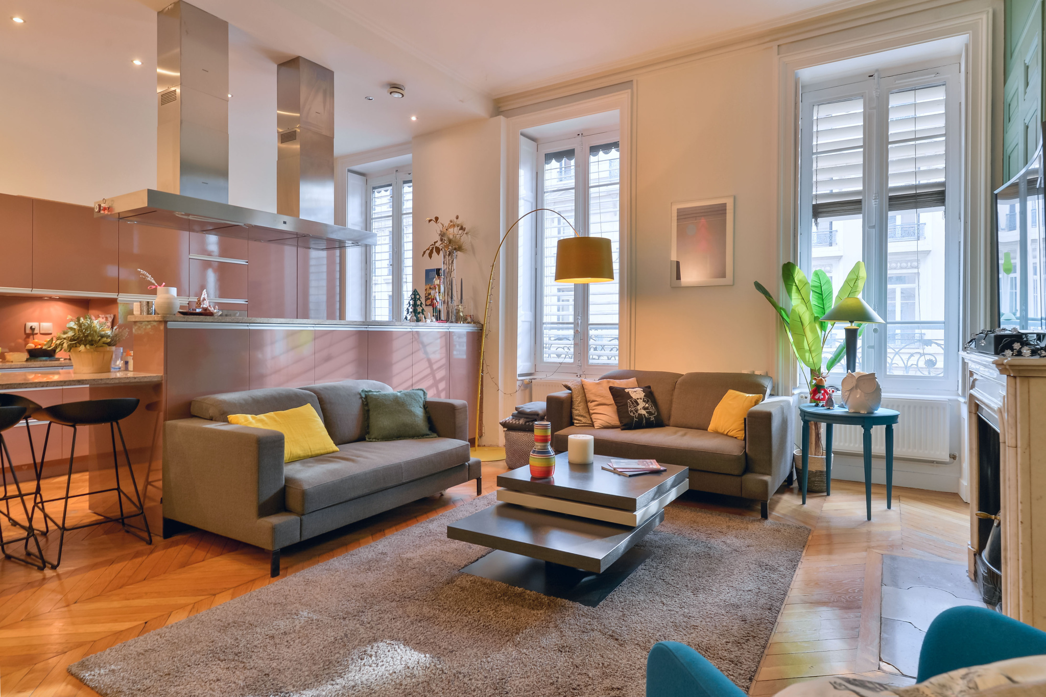 La réception s'articule autour d'un séjour généreux, sublimé par une cheminée d'époque et une ambiance lumineuse apaisée. la cuisine ouverte, parfaitement intégrée, prolonge naturellement l'espace.