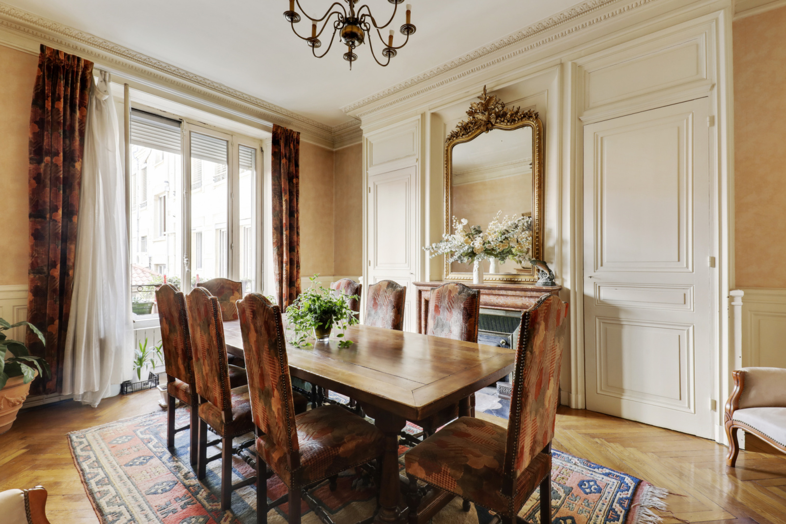 Lyon (69006)Secteur FOCH, à quelques mètres du métro et de la Place Maréchal Lyautey, découvrez cet élégant appartement familial de 157m2 dans un immeuble d'inspiration haussmannienne avec ascenseur. Son espace de vie lumineux de 84m2 comprend une entrée spacieuse, une cuisine et sa salle-à-manger attenante au Nord, un séjour au Sud avec alcôve et un dressing. Côté nuit, trois chambres (4ème possible) dont une suite parentale de 26m2 avec salle de bains, une salle d'eau, une buanderie. Les fenêtres sont en double vitrage bois, le chauffage au gaz avec une chaudière récente. Une cave et un grenier complètent ce bien. Le charme de l'ancien est intacte (hauteur sous plafond de plus de 3,50 m, cheminées, moulures, parquet de chêne)