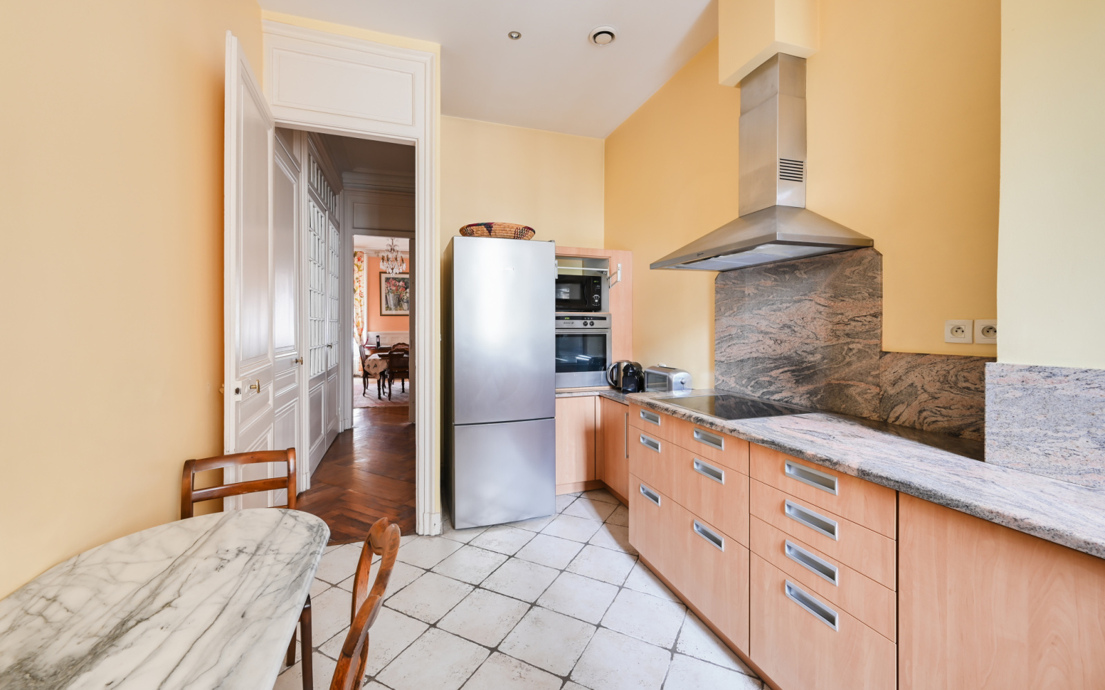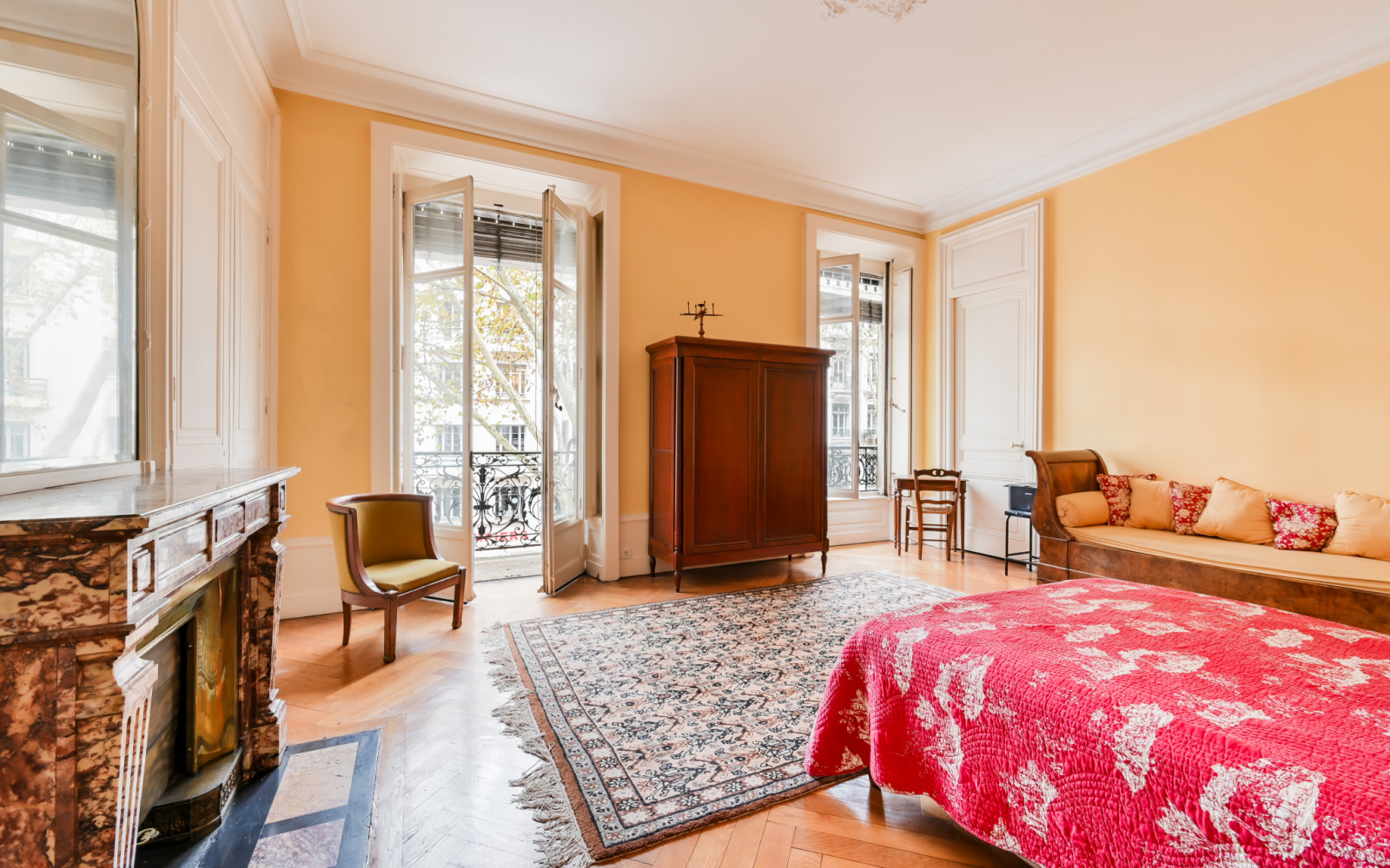 L'appartement se compose d'une belle galerie d'entrée qui dessert l'ensemble des six pièces. Face à cette entrée, deux vastes salons de réceptions de 35m2 et 36m2. A droite, 3 chambres de tailles inégales (28m2 avec balcon filant, 17m2 et 11m2) et une salle d'eau. A gauche, une cuisine de 12m2, une chambre sur cour de 14,7m2 et sa grande salle de bain attenante avec baignoire et douche. Deux toilettes indépendants. Tout le charme de l'ancien a été préservé (belle hauteur sous plafond, parquet, volets intérieurs, moulures, cheminées, stylobates etc...). La grande cour intérieure de l'immeuble est classée et rajoute à la beauté de l'immeuble. En annexe, un double grenier et une double cave.