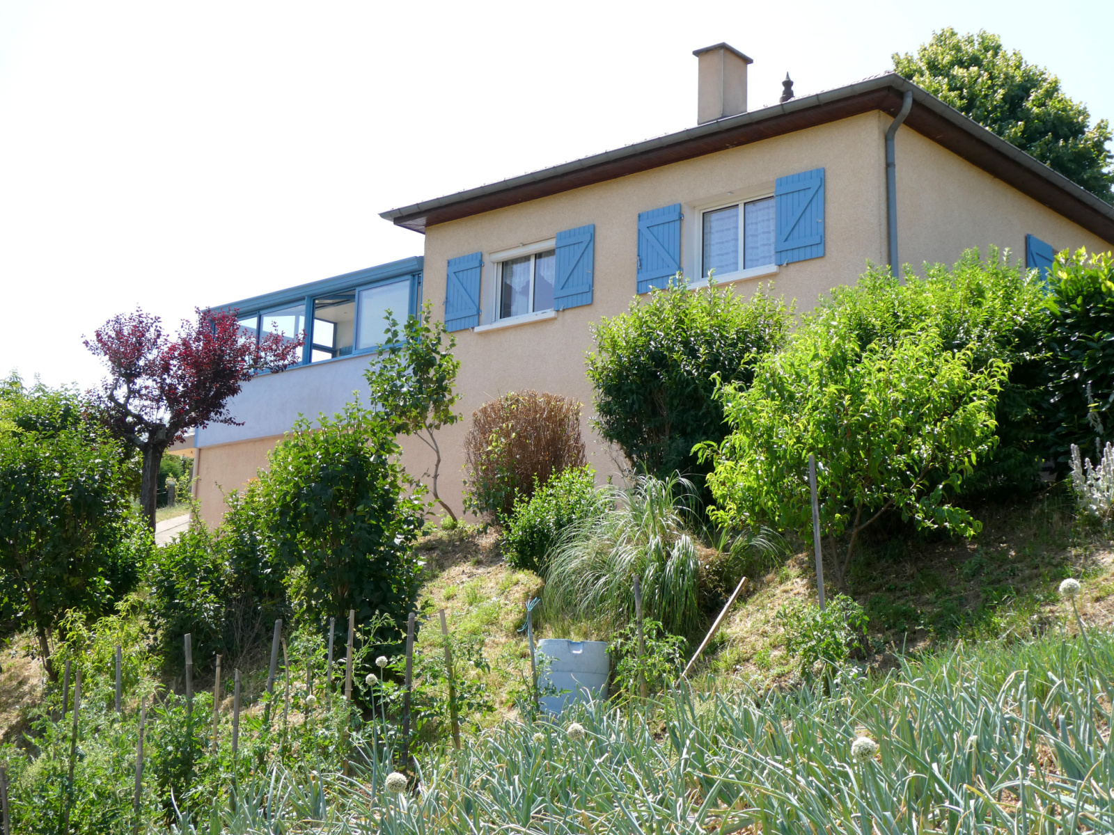 Brussieu (69690)A 10 Min SAIN BEL - Commune de BRUSSIEU - Belle villa traditionnelle bénéficiant d'une très belle vue dominante, élevée sur sous-sol complet en partie aménagé, elle vous offrira au RC : un séjour avec cheminée et une cuisine équipée récente, tous deux ouvrant sur une belle véranda de 17 m², 3 chambres, salle de bains, WC et dégagement. Au sous-sol : un grand garage, une cave, chaufferie et un petit studio avec une chambre, une pièce avec evier, WC et douche. Cette maison solidement batie, prox commerces et école, bénéficie d'un grand terrain bien aménagé avec jardin potager, fruitiers ainsi qu'un abri/atelier de 40 m² et une importante réserve d'eau.