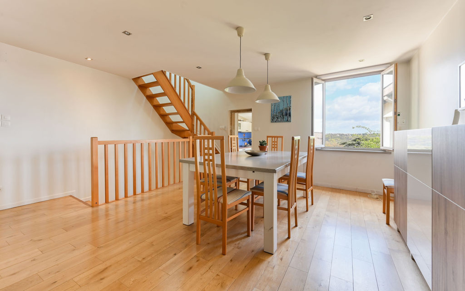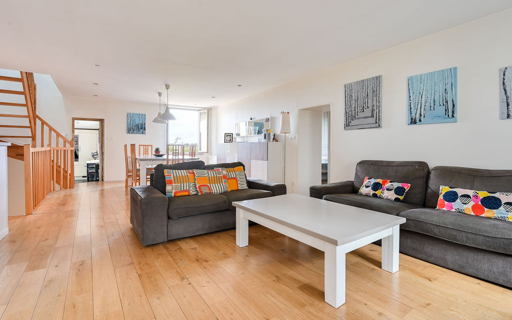 - 1er étage : pièce de vie traversante Est/Ouest, lumineuse, cuisine, suite parentale avec dressing et salle de bains, WC séparés