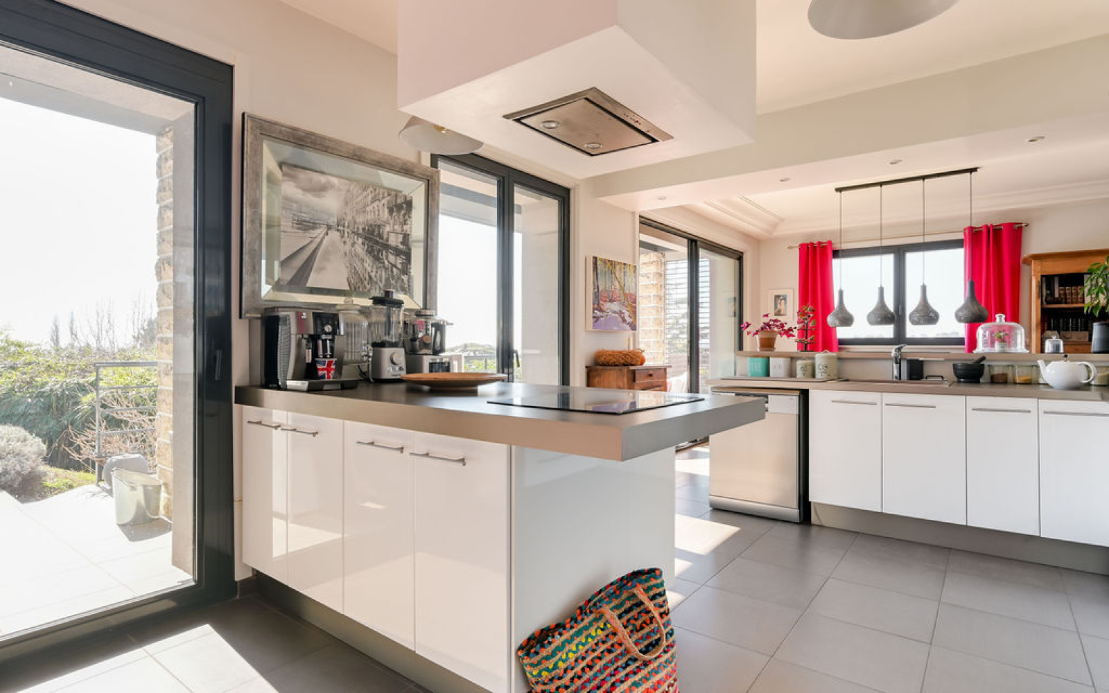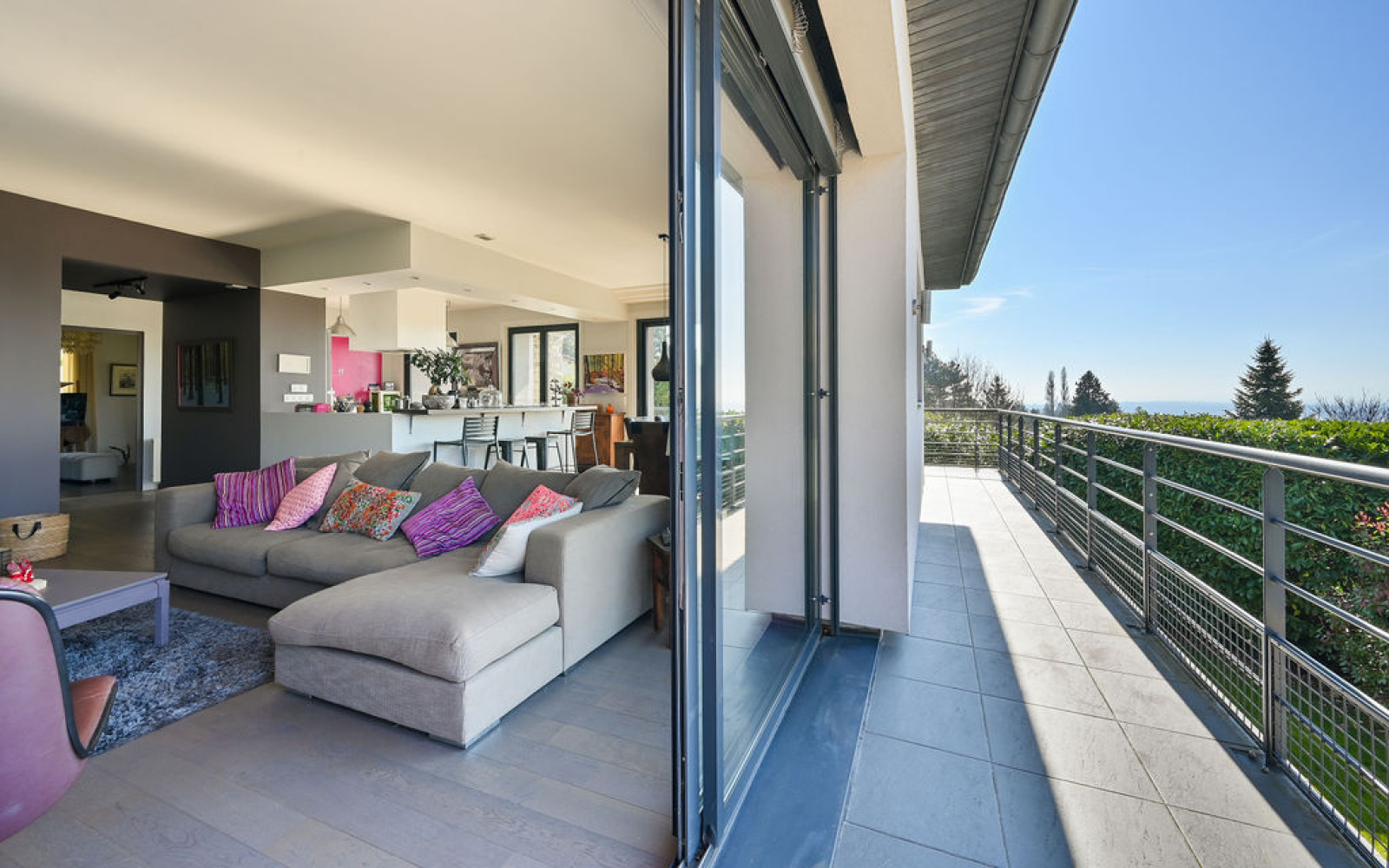 Pièce de vie lumineuse avec cuisine américaine équipée, ouvrant sur terrasse exposée sud-ouest.