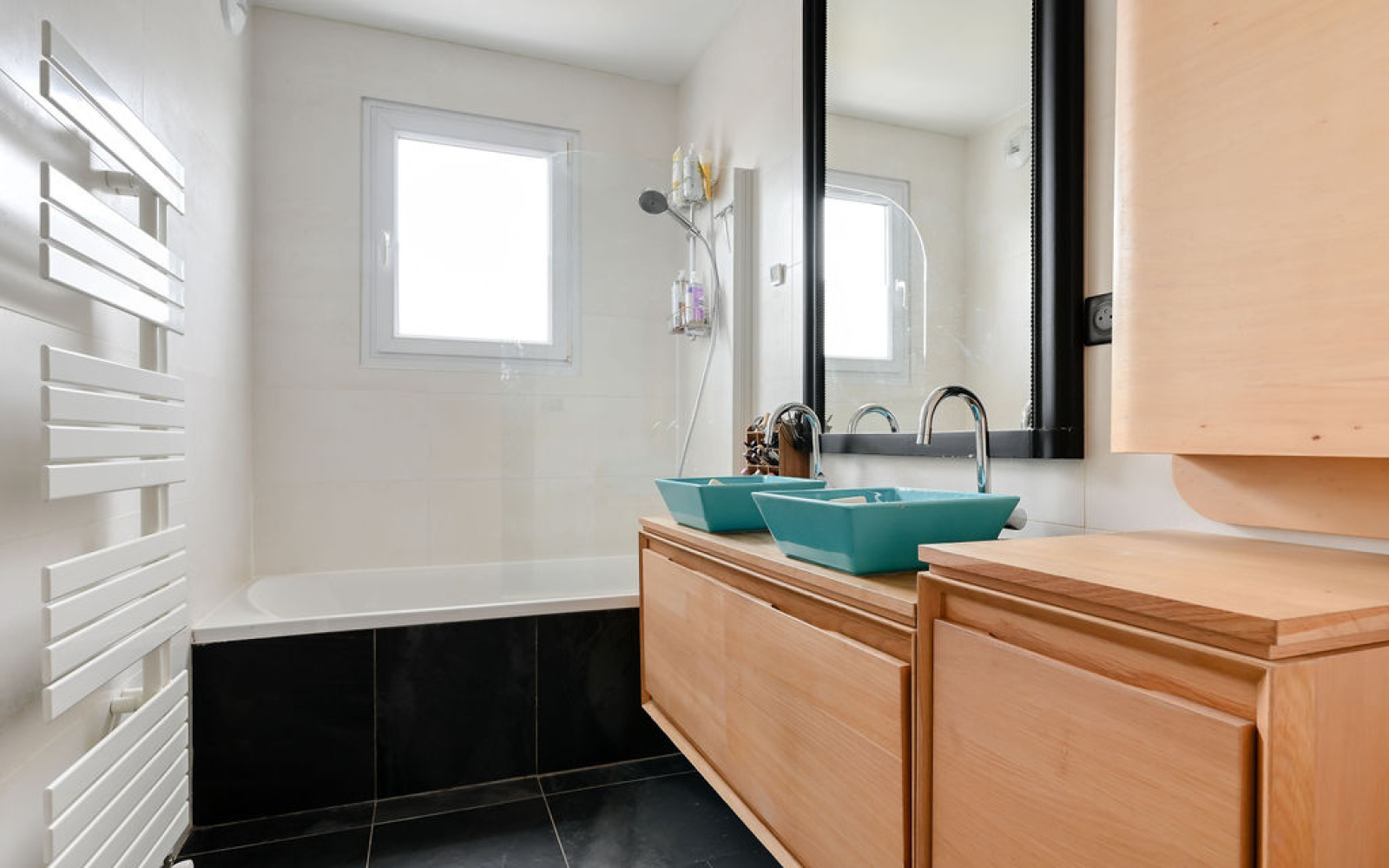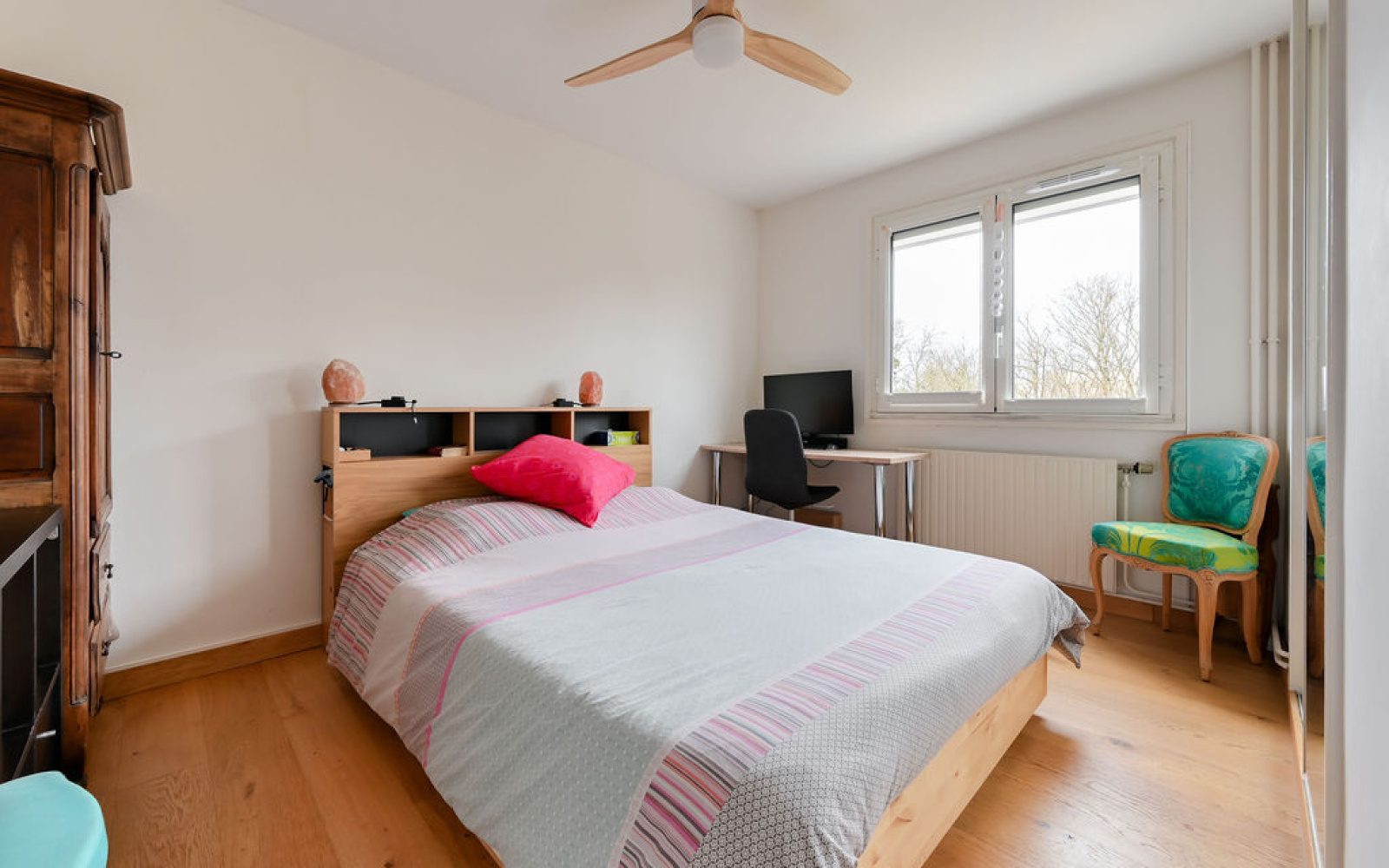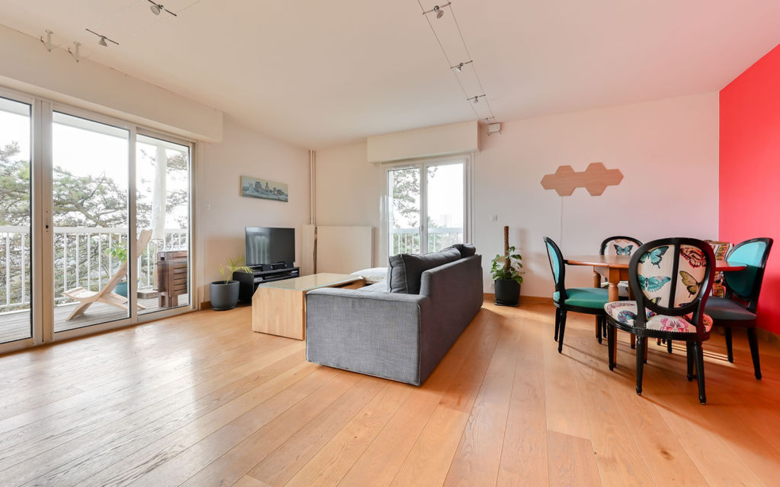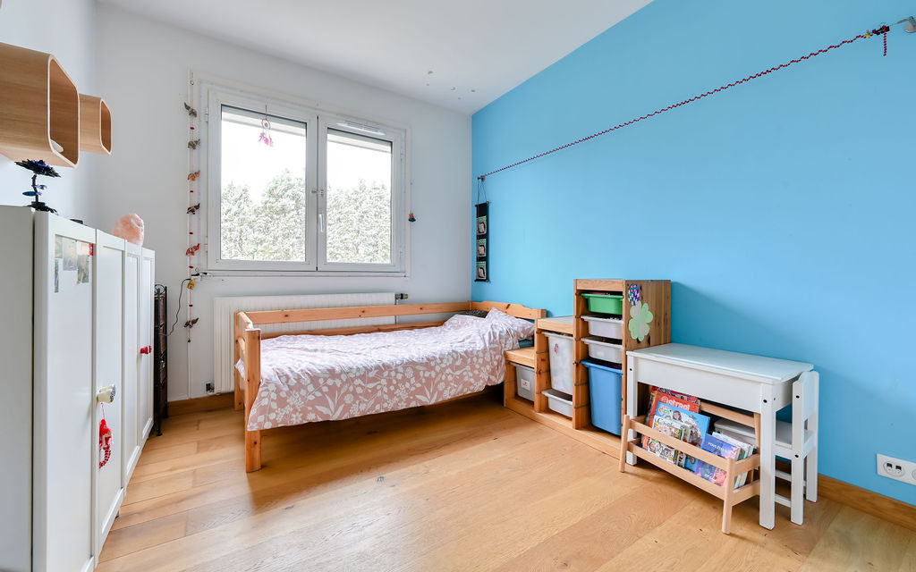 Dès l’entrée, vous découvrez un espace généreux permettant l’aménagement d’un coin bureau. Le séjour / salle à manger, baigné de lumière grâce à sa triple exposition Est–Sud-Ouest, s’ouvre directement sur un balcon agréable de 8m2.