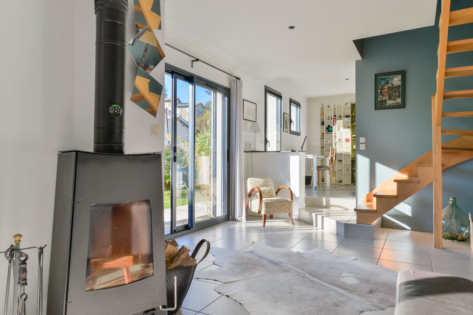 Saint-Didier-au-Mont-d'Or (69370)Saint Didier au Mont d'Or - Au sein d'un quartier prisé, très calme et préservé, jolie maison contemporaine très bien agencée. Elle se compose, au rez de chaussée, d'une entrée avec placard, d'une pièce à vivre de plus de 50m2 ouverte sur la terrasse et le jardin avec une grande cuisine équipée ouverte. Le salon est équipée d'un poêle à bois, idéal pour les soirées d'hiver. Un bureau (pouvant être une 4ème chambre) ainsi qu'une grande buanderie (7m2) complètent ce niveau. A l'étage, vous découvrirez 3 chambres et une salle de douche. La maison est lumineuse grâce à sa double exposition Est/Ouest et ses nombreuses fenêtres. Le jardin clos et facile d'entretien bénéficie d'une grande terrasse et d'une exposition Sud/Ouest. Un garage attenant à la maison complète le bien. Les bus TCL (22 pour métro gare de Vaise) sont à 10mn à pied de la maison.