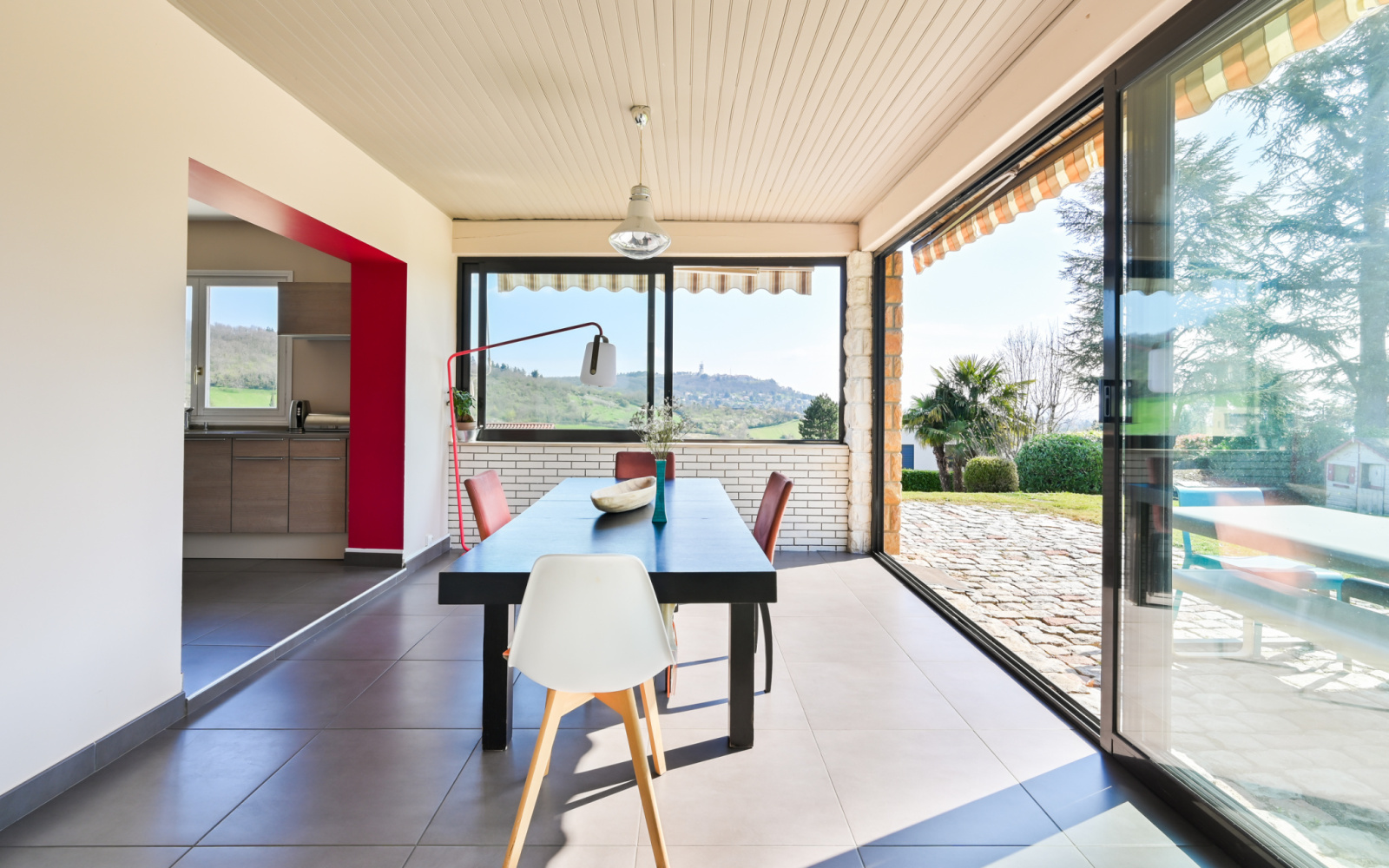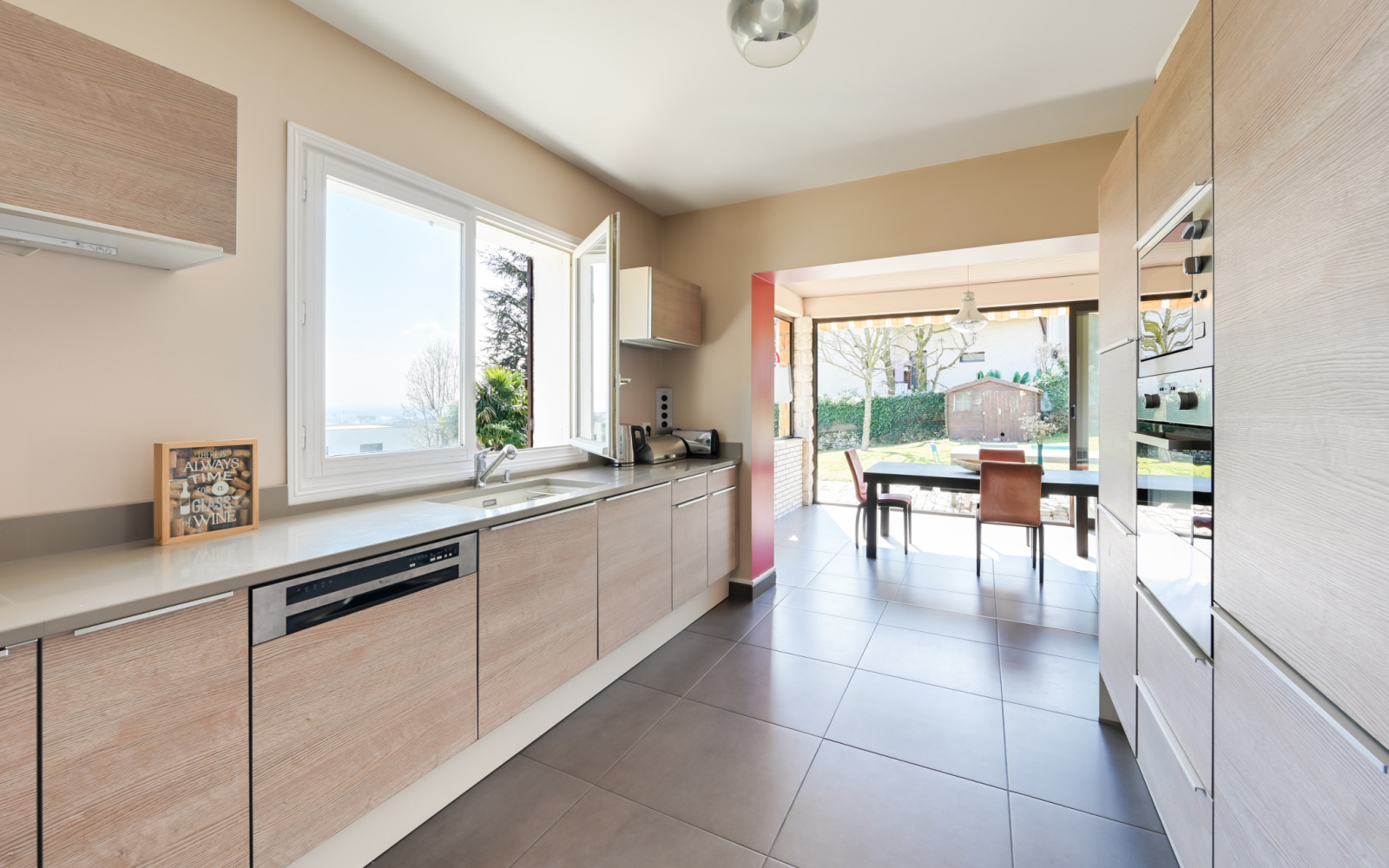 Saint-Didier-au-Mont-d'Or (69370)SAINT DIDIER AU MONT D'OR, rare, emplacement exceptionnel pour cette maison de 1978 d'environ 230 m² utiles avec vue panoramique sur Lyon et Saint Fortunat sur un terrain de 1816 m² avec piscine. Elle se compose d'une entrée, d'une cuisine équipée avec vue dominante sur Lyon, véranda salle à manger donnant sur terrasse, salon avec parquet et belle cheminée. De plain pied, 3 belles chambres, une salle de bains avec baignoire et douche italienne, toilettes séparés. Au niveau inférieur, un grand dégagement dessert 2 chambres dont une avec possibilité d'ouverture via une porte fenêtre, home cinema, une salle de bains avec toilettes. En annexes, un grand garage, une cave à vins, une chaufferie/buanderie, un cellier. Nombreux placards, maison à fort potentiel (possibilité d'agrandissement ou surrélévation zone URi2c). Honoraires charge acquéreurs 3.5 %