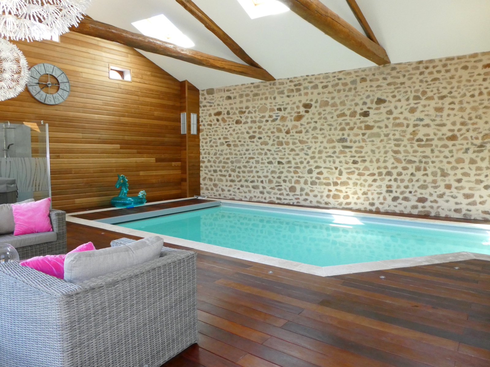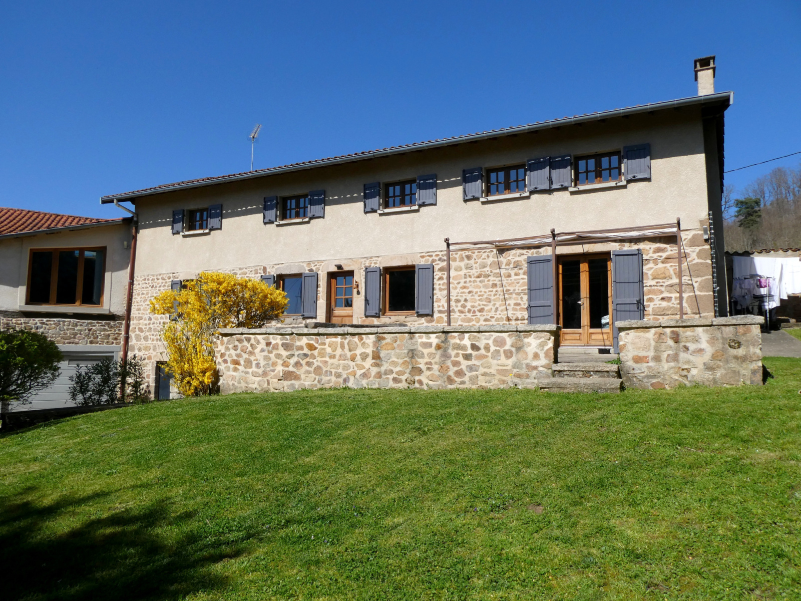 Longessaigne (69770)Au coeur des MONTS DU LYONNAIS - LONGESSAIGNE - Vous êtes amateurs de belles surfaces et de biens de caractère ! Cette très belle ferme rénovée vous offrira un généreux volume de plus de 300 m² avec au RC : salon, salle à manger, cuisine équipée, une salle de jeux avec mezzanine (+ 40 m²), WC, 2 chambres et un superbe espace de 100 m² avec piscine intérieure chauffée.
