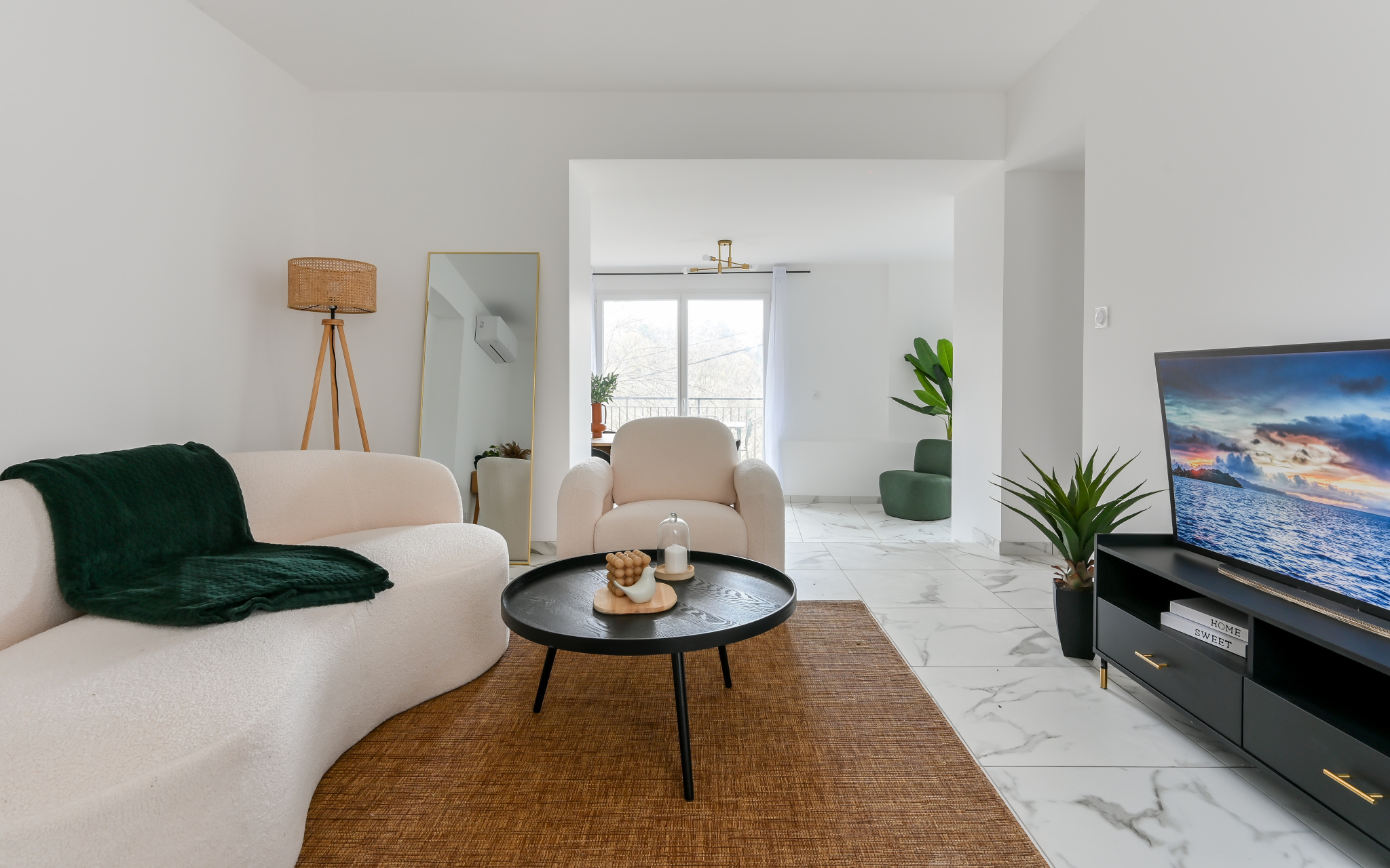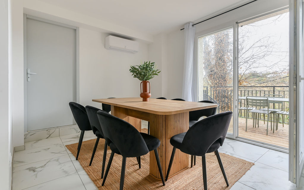 La pièce de vie lumineuse réunit une cuisine ouverte qu'il reste à aménager, une salle à manger agréable ouvrant sur une belle terrasse permettant de profiter d’un extérieur malgré l’absence de jardin et un espace salon. Une chambre avec sa salle d’eau privative et un wc séparé complètent le niveau principal.