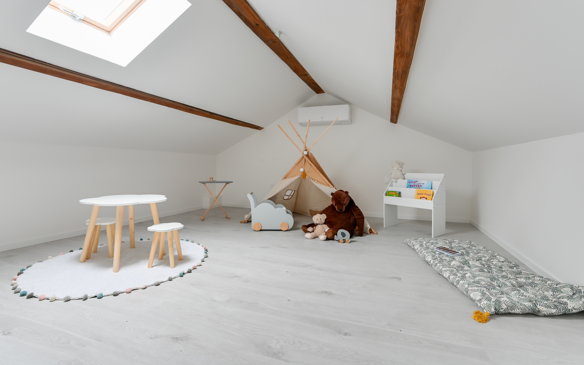 À l’étage, vous trouverez deux chambres supplémentaires ainsi qu’une seconde salle d’eau avec toilettes. Les combles ont été aménagés en salle de jeux, offrant un espace polyvalent pour le télétravail, une chambre d’appoint ou une zone de loisirs pour les enfants.